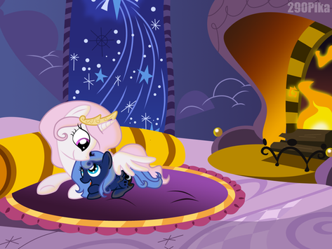 So Luna had a "vision" of the future in which she saw herself turn into Nightmare Moon and had to fight Celestia. Just an interesting concept I was thinking about. Oh, Luna doesn't have her cutie mark yet. In the S4 finale we see that the black spots are actually markings separate from her cutie mark. However, since Tia's talent is to raise/lower the sun, she assumes that Luna's talent is to raise/lower the moon and has an idea that she could be a dream-walker.