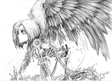 You never seem to amaze me. Your work is absolutely amazing. As a long time fan of your art (since the days of teamARTAIL...oh, the memories), so I am finally glad to express an appreciation for your art by giving a detailed critique. I have already faved this picture, but I will tell you what I have seen in this picture. The first thing I notice is the black and grays in the picture. They stand out against Halcyon's pale hue and feathers. The detail put into the zippers and cargo pockets is amazing. The leather texture the color seems to portray gives a punk rock, sci-fi feel to the piece without disrupting the fantasy aspect of it. I know you love the belts, so I am glad to see you using those generously again. I noticed the detail in the strands of string (I think) entwined around her feathers. Now, the feathers are remarkable. They have the properties of air in the sense that they flow from the "arm" rather than just alligning themselves up orderly. It's almost as if the wings were capes flapping in the wind. Maybe even hairlike. Hal's face remains hidden. It really does look like she's scratching her nose. Either that, or she is about to cry because maybe she fell out of the sky. Or she can't get in the air in the first place. Either way, she is very cute and cuddly. I would throw her in the air and catch her if she fell. ^_^ and the Cap't America/Hawkman temple wings are a nice added touch. The one thing that caught my eye was the proportionality of the feet. I don't know if it was intentionally exaggerrated, but one foot is significantly bigger than the other. Even foreshadowing should not reduce the foot size that much. If I am wrong, please correct me. I actually wish the background had more detail, but I see how you get tired of looking at the same picture after drawing it for so long, so I won't complain. You are a Photoshop genius. Keep up the good work. I'll be commenting on more of your art, so look out for me. BTW, how's the graphic novel/novel coming along? I hope you haven't given up. Anyways. Good luck with your future artwork and completing your commissions. Peace.