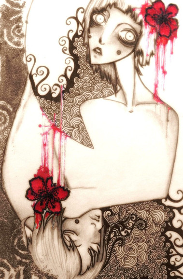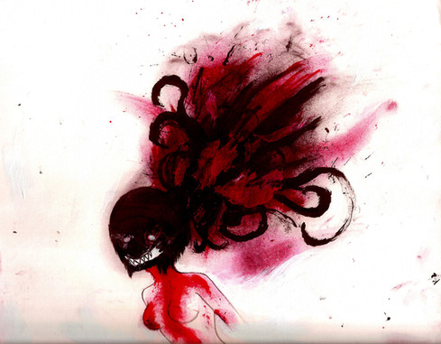 Woa. Creepy! The blue eye on the red face really stands out, and I love the way the hair curls over the frame. Neat!