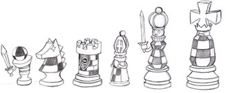 Personally, I like the Rook. the best. The Rook. A corner castle with wings? Who wouldn't want to look up at that! Oh, but the eyes... hmm. Wings > eyes, imho. This whole set up is genius. I think someone should turn this into a real chess board. The design is superb. Although, team work with the bishop and the rook, okay, I'm in love with the ink designs. That is all.