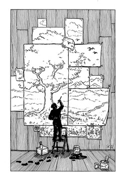 I like the cross thatching and buildings on his umbrella. It is also pretty cools how you did the tear drops and I like the thick but not bold lines of the clouds.