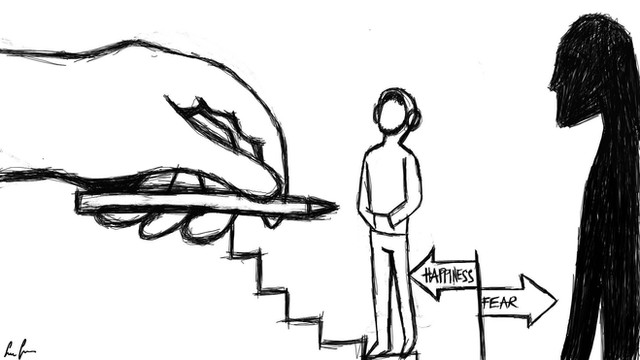 's pretty sad. The city is all that keeps him getting wet, but it looks like the burden of the city is almost too much to bear and he might just get rid of the umbrella eventually... if he finds the courage to do so.