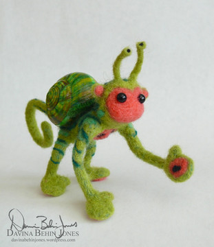 An experiment in tiny needle felting, which I am bad at. This is as small as I can get without going (truly) insane. He is about 1.5 inches long not including his tail and about 2 inches tall.Made out of needle felted wool. He has a pipe cleaner skeleton so he can be posed. The shell is a garden snail shell I found abandoned in my yard, which I then cleaned and painted. The eyes are beads.