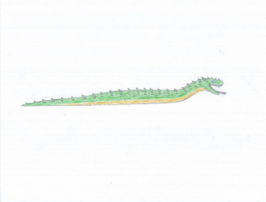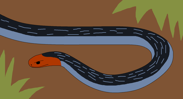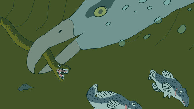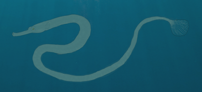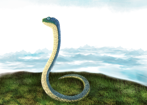 This is the Atargatis (Atargatis platicauda), a piscivorous aquatic snake native to Fourseas. Fourseas is a huge brackish Eurasian lake formed when sinking land caused the Caspian, Black, Aral, and Azov seas to merge. Aquatic predators evolved to feast on the abundant fish fauna of this body of water, including descendants of common European grass snakes. This reptile is relatively large (about three meters, or ten feet) and has a tail which is flattened from the sides to improve its underwater mobility. The tail also has a brightly colored eyespot to distract even larger predators as well as being a courtship mark. Unlike present day sea snakes, the Atargatis is non-poisonous, and kills the fish and crustaceans it feeds on with a strong bite and long teeth. The Atargatis hunts with smell and can hold its breath underwater for up to an hour.Related content