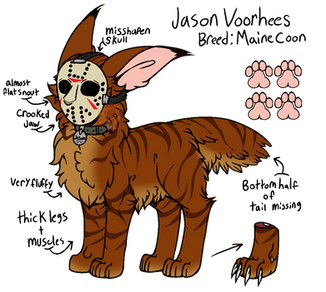 CandyMeow is affectionate, clingy, and has pretty separation anxiety. He chilled out on the violence after coming to the Slashercat cafe, especially after Helen started working there. Though he will get aggressive if he sees anyone bothering the staff (Especially Helen), or if any of the 'problem characters' drop in. (Dr Loomis, for example.) He is the one cat in this damn cafe who acts and looks the most normal. He's very lovable, and very hard not to like by... anyone, really. The only ones who don't like him are Freddy and Chucky, but they hate everyone, so that's not a surprise. Most of the cafe cats try not to fight him due to his prosthetic, which could easily kill one of them. When Helen leaves the cat cafe, he sits at the front window and waits for her to get back. Funny enough, a hive of bees moved in behind the cafe after he arrived, and CandyMeow is the only one who can get close without getting stung.