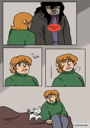 Immediately afterwards we see the main character talking with a friend of his, and the main character's cat noticing some feet appearing under the door.