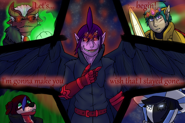 A fox, who just so happened to also be a vampire, who wanted nothing more than to touch the stars, in fact, he wanted to be a star! He went to the devil and asked as such, and the devil took his deal, in return for his servitude. The devil gave him the ability to turn into a constellation-like form, whilst also giving him the ability to turn into a shooting star, fire star-like projectiles, breathe fire, and other star-like abilities. King Dice, initially, is a bit hostile towards him for the simple fact that he initially sees him as a rival for his spot as the devil's right hand. ...He quickly realized that Vulpenire is not at all interested in taking that spot, though.