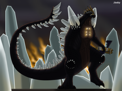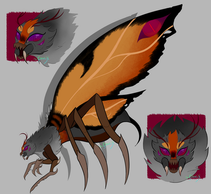 The body of Goldzilla with Mothra's wings, head and claws mixed in the best way i could manage to show both. Mothzilla is a smaller, more agile kaiju to Godzilla. She can definately fair well in a battle of speed compared to other land Titans. Though faster and lighter, she isnt as strong as Godzilla and can't fair well in head to head with larger titans. It also doesnt help that like Mothra, Mothzilla has an attraction towards tiny humans and an urge to defend them against other Titans and catostrophic events, which does make her hold back when fighting.