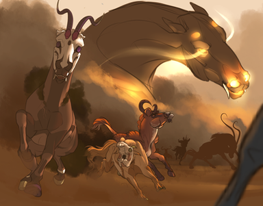 Before he could stop himself, the roar of his cracking, aged voice split the sound of rain. He bounded forward, hooves thudding onto the slippery grass, sending water flying. The wolves looked up, and knowing in their sickly state they were no match for such a large horse as himself, quickly left the scene, only to stand under a nearby tree to watch.
