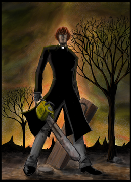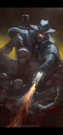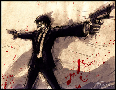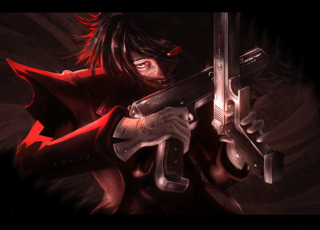 Oooooo, that BLOODY HELL!!! I see many comments say "remind AlukarD"(Hellsing anime), yep! That vampire pretty like this! Search&destoy!!!!!