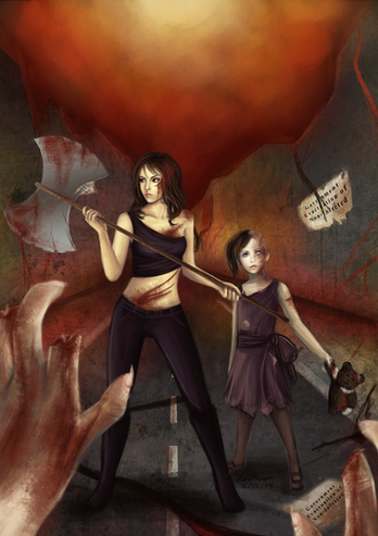 If she had a small corroded flower (that looked like the one's on her painting) tucked in her belt somewhere that would be a small emotional touch to show that there was/is at least a small bit of her former innocence left.