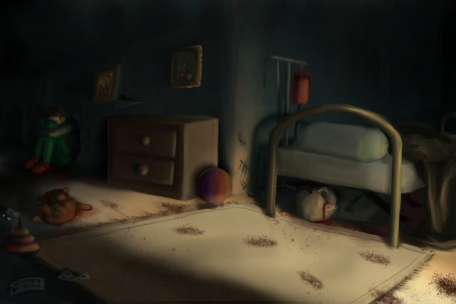 second environment illustration for group project (concept for horror tv series) for my character and object design class.creepy little girl sleeps under the stairs there...