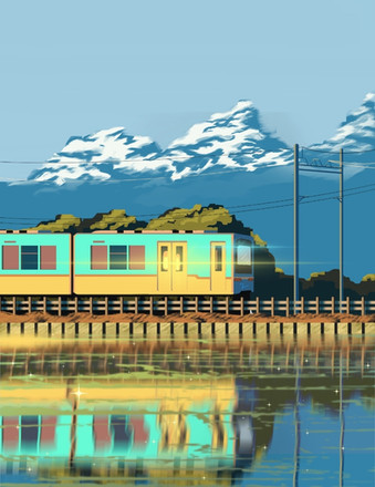 In this illustration, I played around with a lot of layer transparency to create the effect of a crystal-clear lake while still maintaining the visuals of the submerged tracks. I added more details to the tracks themselves and reduced the texture in the surroundings to create contrast. It was a challenging yet satisfying experience to create something as complex as this. The end result was rewarding, and I am extremely pleased with it!