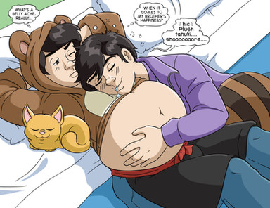 Ben laughed and gave Vincent’s tummy a brief tickling, making him squirm with laughter. “Let’s see them kicking again while I finish up”. Vincent rolled his eyes and began sucking his gut in and pushing it out, so it looked like “the twins” were kicking. They both giggled, but Vincent gasped as Ben suddenly leaned forward and stuck his tongue into Vincent’s belly button while he stroked his penis faster.