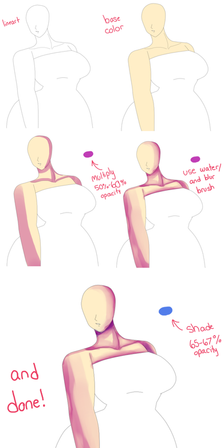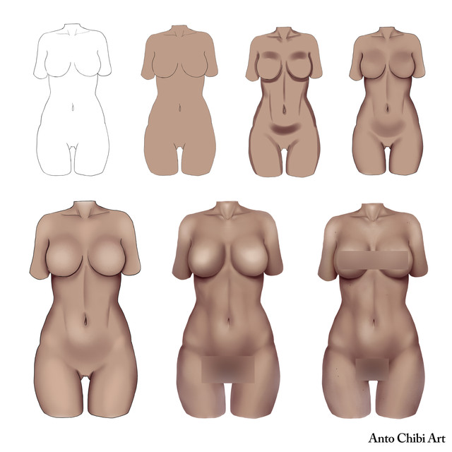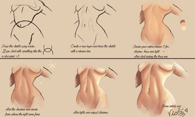 Step two, this is going to be the base to your shadows, I used a watercolor brush on ms5 for this, on traditional you cant scribble it on as much as I did but just start from where you want the shadow to start and just make light marks over, giving it a airbrush effect, its hard to explain over text but you will just need to lighten the pressure every line or so to make a sort of gradient, again, best to start light and add layers of dark as you go. Find your light source and its important to imagine the bumps and curves on the body and what shadows they might cast. getting used to this may require references, either of real people or others drawings, however simple or complex you want the shadows is up to you, but for me I find the light source simple enough to help imagine shadows. areas to keep in mind for shadows are, under the breasts, the neck under the head, knees and dont be scared to add shading to the tummy like I did here! Experiment with what you like the result of most!
