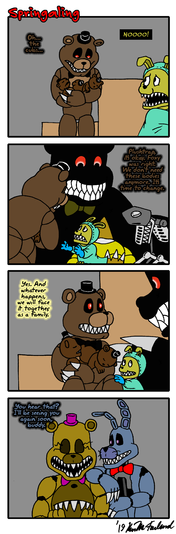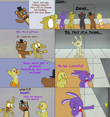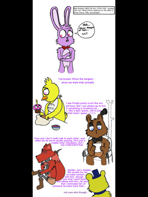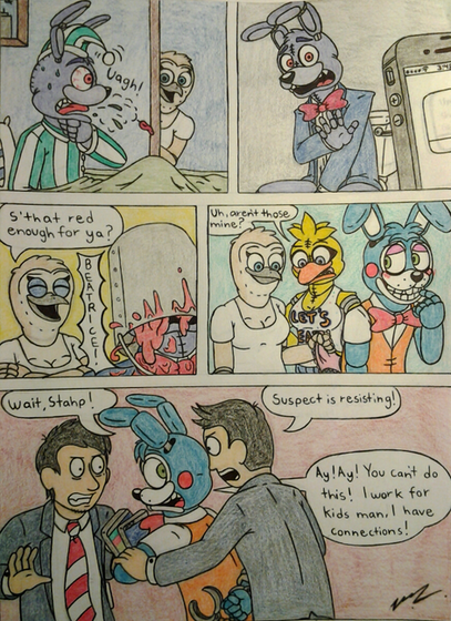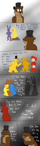 Bonnie: I can't read... What does that say?Freddy: Two local children were reportedly lured into a back room during the late hours of operation at- uh, let's see... June 26th, led to his capture... Dressed as a company mascot...