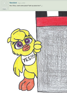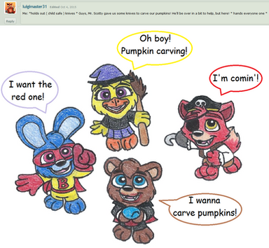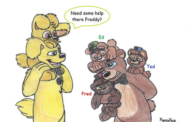 Scotty: Of course they can. In fact, we're looking to hire people to babysit.Freddy, Chica and Bonnie: YAY!!!
