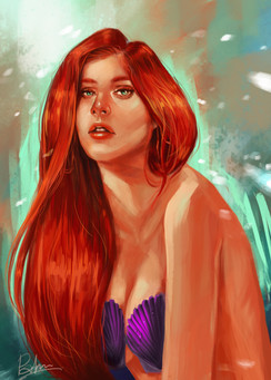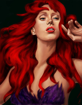 You've constructed the tones so well, what with the fiery nature suggested by her hair, the soul rendering oceanic blue of her eyes conveying vulnerability, the rosy embarassment in her cheeks, not mentioning the way you use shades of light and shadow to highlight her form and its contours...I like your style very much. I also really dig how moody she looks...it just adds to her beauty in this image.
