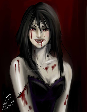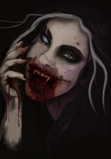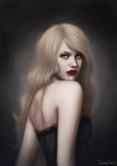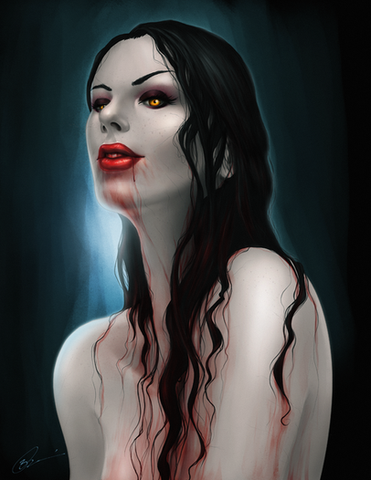 Wow. So many things work so well in this picture. The hair's flow and weight near her back, the shape and little kink in her nose, the dark sultry look in her eyes, the attachment of her wing to her back, very interesting to see. I really really love the blood though, such a good contrast between her pale skin and the warmer blood on her lips and fingers. It really denotes what could have happened before, which makes this piece even better. My favourite piece so far from you, beautifully dark work here.
