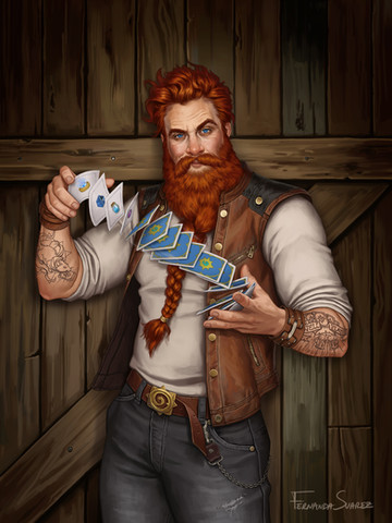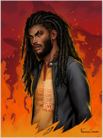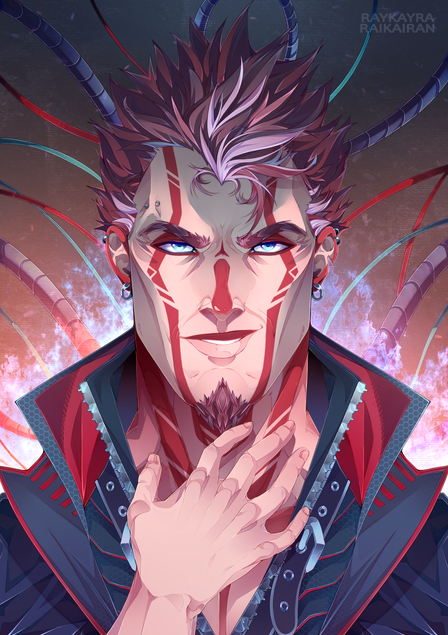 It's wonderful! I love the vibrancy of the hair and all his tattoos, as well as what you did with the background with Cerberus
