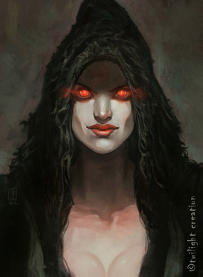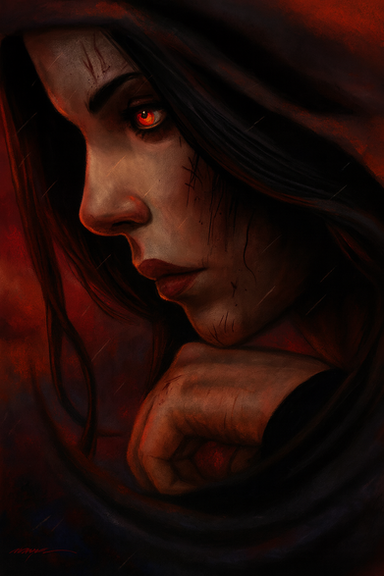 Her stare implifies a lot of danger and somehow 'disgust' as if she could kill someone with her glance. You did a great job on that. The background seems as if it is in motion which is pretty good. The only thing in this painting that 'disturbs' the flow and the emotion of it is that the character seems as it doesn't fit to the background. The contrast between the bg and the chara is too 'strong'. All in all a wonderful piece of art. <3