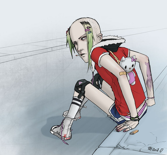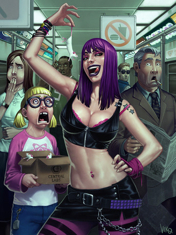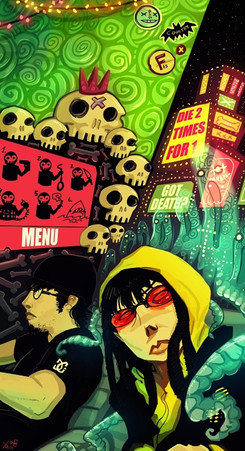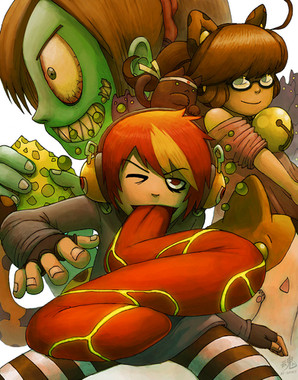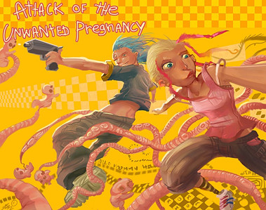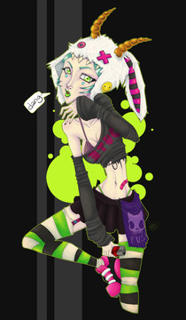 Love the color, as usual. Is she not wearing pants? XD I like their outfits and overall design, and it's nifty how you didn't use solid separating lines in the background. I always admire artists who can do that. It's very spookeh. The eat me sign reminds me of Invader Zim. Sorry XD I know you probably hear that quite a bit. But the horrificly comical faces normally do that to me.