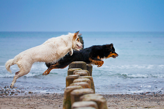 Amazing shot! These blue merles can't half jump!