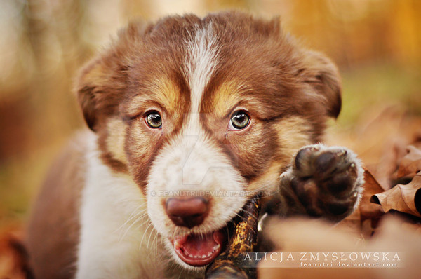 Adorable, and wonderful colours! Reminds me of a time I felt my dog nudging my leg, so I looked down and there she was, gazing happily up at me, with a big feather balanced perfectly on her nose. Never seen anything cuter in my life.