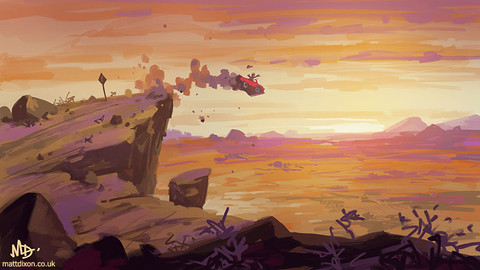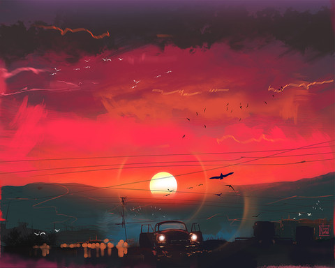 The colours and that smoke/dust trail the car is kicking up are great.Β I spent a bit too long staring at the sun (glad it's just a picture and I can do things like that without going blind ), I really like how you did the sky.
