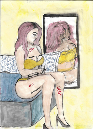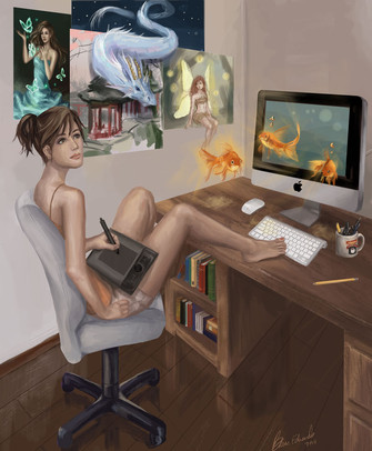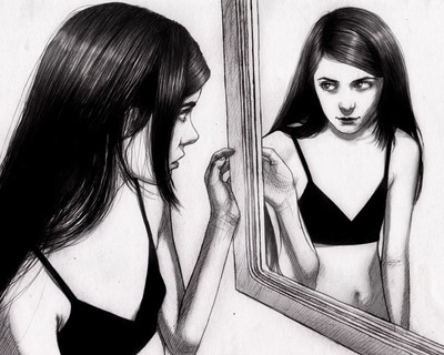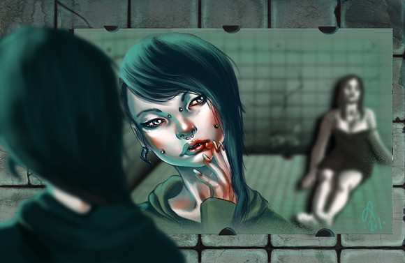 It depends on the picture. Straight on mirrors are easier because you can basically just the outline. THis one was angled so I took my own reference picture using my sister as a model. The important thing with references is that you do not copy exactly and the imagination must compensate to make the lighting/colors fit in.
