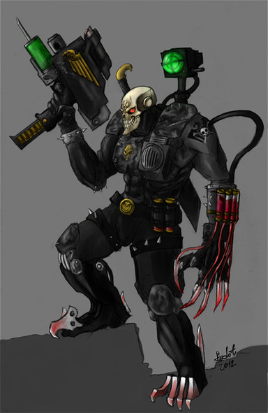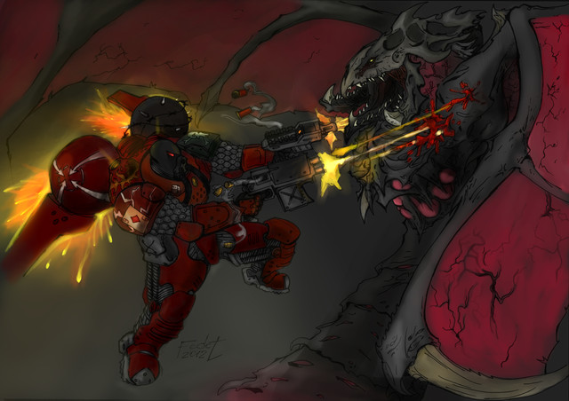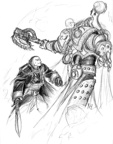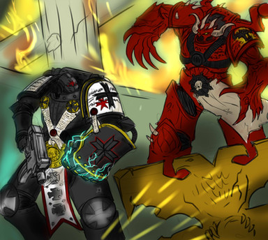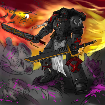 for "marine in a hand to hand struggle with a Necron warrior" "Raven Guard Sargent with Mark 6 Corvus armor and a power claw. The blades on the claw should be slightly curved and a bit thinner than the traditional power claw" "No jump pack. He's an assault marine. I'd like for him to have a master crafted bolt pistol in his other hand."Related content