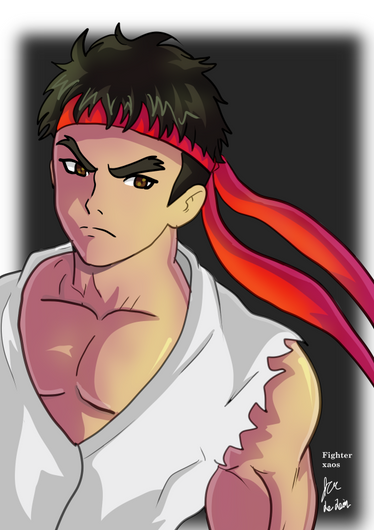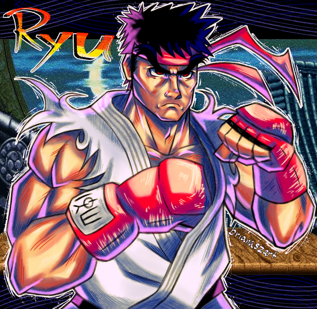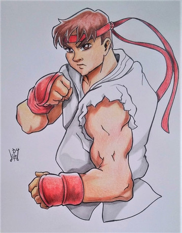 Ryu(©Capcom) from the Street Fighter games as he appear in (Ultimate) Marvel vs Capcom 3.(by Capcom)Painted with Black fineliners, watercolours, pastel pencil and white ink on watercolour paper. size: 12x16cm