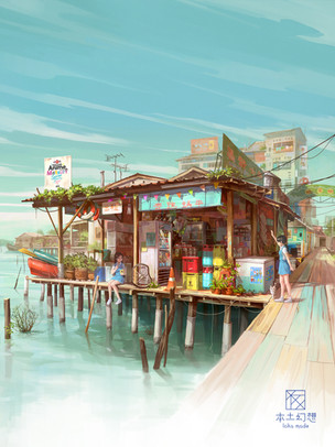 When you say, "...my new project" are you calling this an original work? I have this image stored on a drive somewhere but as I recall; the stored image I have does not contain the figures outside the shop and there are a few other differences but, it is very much the same scene. I'll look for my stored copy but in the interim if you are using another persons work as a starting point it would be more correct and nicer to credit the original and call this a variation on the original. Give credit where credit is due otherwise it makes you look like a petty thief. I'm not saying that you are appropreating someone else's work but I'm certain I've seen this shop seen at least a few years before now.