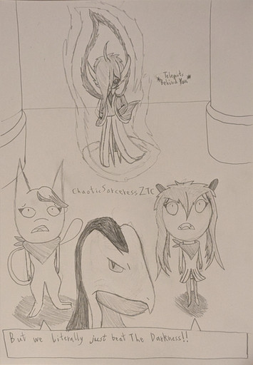 Rikuku(light green),Lizizi(black),Haruru were just doing whatever then they see Vanini(me as a keronian) running away from something. I tell them to hurry and run,i grab their hands and speed off somewhere deep and dark. They see that creature looking around the area and eventually he leaves.
