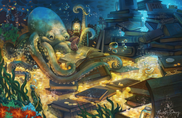 Your electric fish is wonderful! I love this smile. Octopusses are sweet, too. And the change of light's color from yellow to blue gives a lot of depth to the scene.