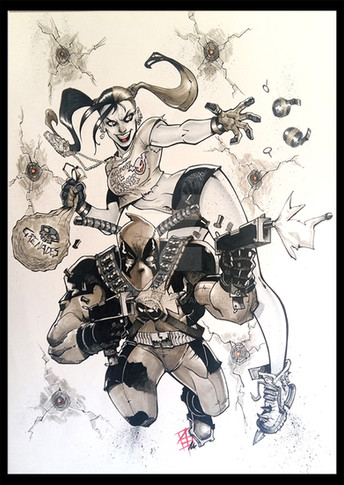 The comish was Deadpool taking a selfie, i thought, who could be there with him in that selfie, so i chose group of individuals who might hang around with him, what dog you think, could you see this guys all hanging together????Ink and Copic (greys, both cold and warm) on Bristol A4 board.