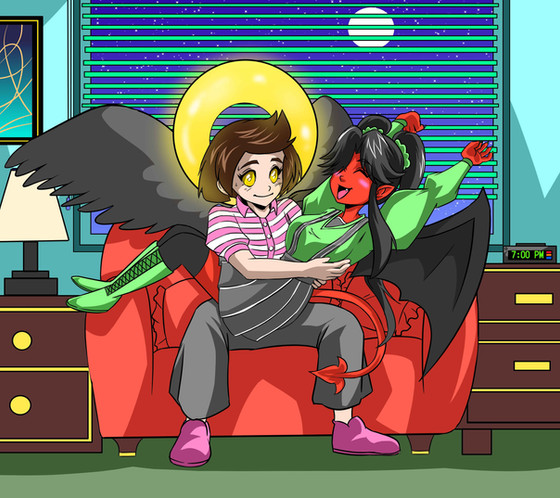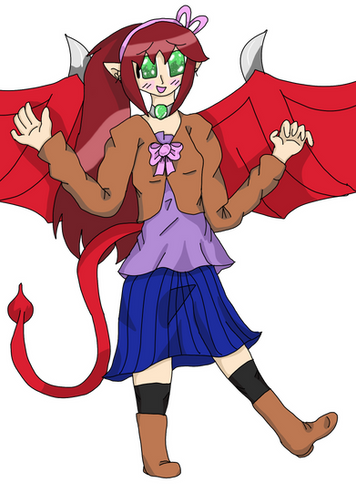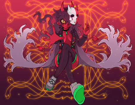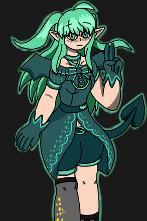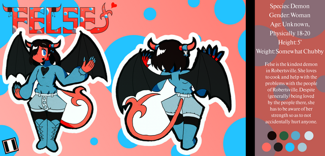Ah, the shy rogue demon. She got picked on, not for her magical sex change, but for being soft, not big enough to be a ruthless member of a pack of demons. When she left, she met Aculea, a angel with a similar story to her. They bonded over their backstories, played a bit of Greater Cards, learned what "transsexual" really meant, and the rest was history. You can see them hanging out in the Mortal Plane in the background of humans. Felse, much to the slight dismay of Acu, likes to make clothing for herself and others, researching what the new trends of human fashion are. It's hard work, especially for a long-lived demon like her, but her transition was hard work too, and she does what she sets her mind to.