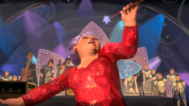 ¡Esta genial! El contraste que hace el rostro y las manos en blanco y negro con el traje, es muy interesante, igual encuentro que la forma en la que se complementan estos colores hace que se pueda percibir el balance y la armonía dentro de la composición.