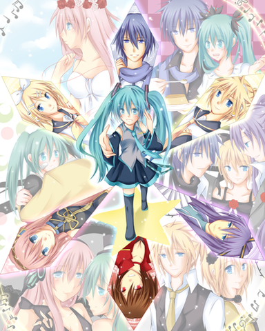 This piece may be too cluttered but it's finally completed! After this I'm taking a break from doing vocaloid fanart. It's time for me to move onto other things!The characters Teto Kasane (Girl with pink curly hair) and Akito Neru (Long blond pony tail girl) are technically unofficial characters created for a prank [or some sort] on 2chan but they were added to this picture because I thought their designs were more interesting than Meiko and Haku.