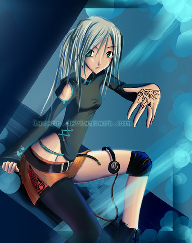 Great picture overall, before I go into detail, you're either really talented or put a ridiculous amount of effort into this. Or both, possibly. Great detailing on the costume, and the background symbol. Took a while to notice, but the repetition of the design on the tattoos and shorts is a nice touch. The blue and purple all over really suit the feel of the picture, and the character, and so do the details of her costume, especially the fiddly bits like the fishnet and the layers on the top.
