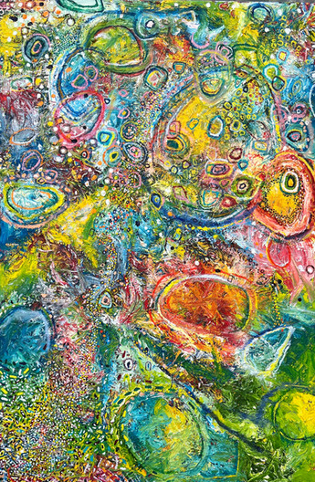 This is artwork in a series inspired by natural colors and shapes.It's expressionistic abstract painting with multicolor textures and floral elements, painted with professional acrylic markers and watercolor paints on watercolor paper 500 gsm.