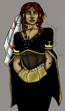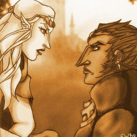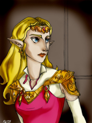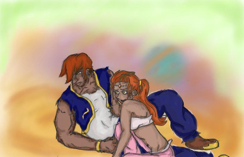 tu trouves que tes couleurs sont ternes?... Moi je trouve qu'il fallait pas spécialement qu'elles soient plus flashy/énergiques, c'est pas plus mal qu'elles soient plus sombres/calmes/chaudes, ça renforce l'aspect d'intimité qu'il y a entre ces deux-là. ce qui est bien aussi, c'est la "ressemblance" entre les deux bonshommes, on sent que Ganondorf est beaucoup plus 'brut' 'dru' ou 'sec' et que Zelda est plus 'douce' 'élégante'et même 'gracile', mais pourtant y'a quand même un trait commun entre eux qui les rapproche encore davantage. p'is c'est délicat de sa part de lui prendre ce bras si doucement. c'est rare de le voir se comporter de la sorte XD