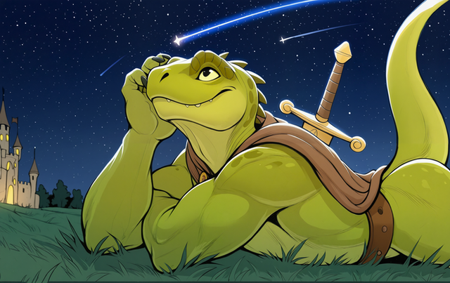 #adventurer #ai #anthro #fantasy #lizard #male #reptile #scalie #shootingstar #sunset #furrymale