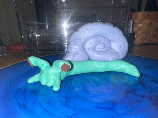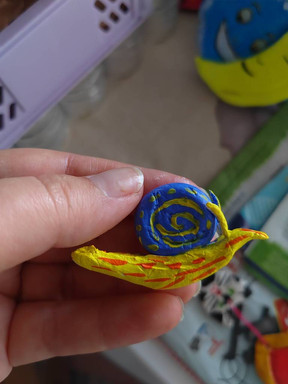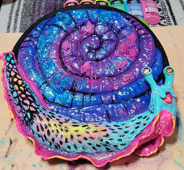 The snail was purchased as a blank canvas for painting. This is what I would assume they wanted to be displayed as the front, because it has a textured spiral like a snail shell, but not on the other side. It was very difficult to paint in this spiral because of the texture but I think I did ok. This is painted in acrylic.