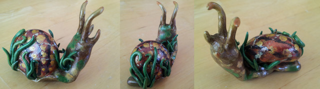 My latest big painting project, a snail flower pot. I do plan on varnishing it and putting a plant inside, but I posted it without these things so you can see all the details.Although the pot is small enough to fit in my hand it took me a whole year to finish. This is mostly because I wanted to post it during springtime, but that came and gone and so I waited a whole year to work on it again. But I knew I had to finish it for good this year, so I went on overdrive to get it done before summer.