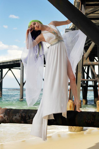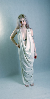 Blue hair notwithstanding, the white outfit is far more classic-noir-film than greek, and the background architecture is anything but. As for the necklace, well.....