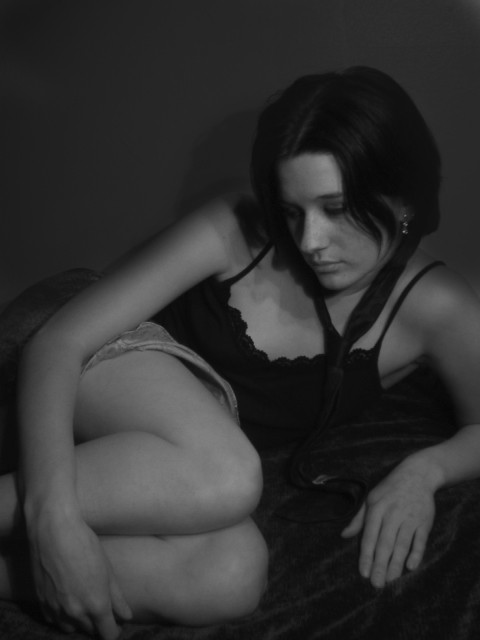 This is the most dramatically moving piece in the series thus far... The black and white photography and tear stains have immediate impact. Interesting choice to show some cleavage, too, which in the context of this particular image and your story could be viewed as "tools of her trade" rather than just part of who the character is. This character you're portraying has great pathos and demands to be respected as an individual doing a job she hates in order to survive.