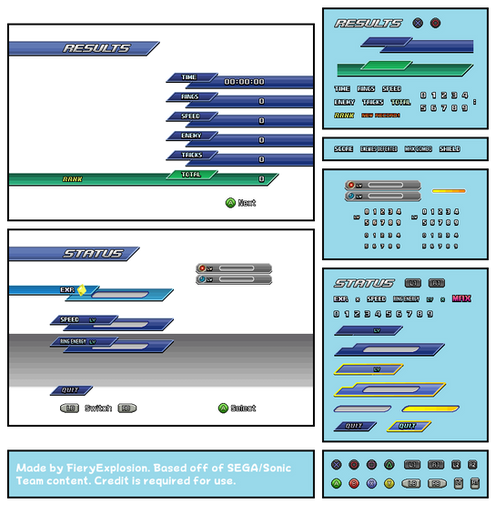 Out of boredom, I decided to do the text pop-ups (Ready, Go!, Nice, Cool!!, Great!) from Sonic Unleashed. Unfortunately, I wasn't able to just reuse the same font from my Day/Night Results sheets, but it was a good exercise all the same.