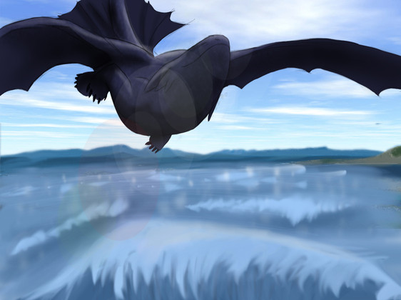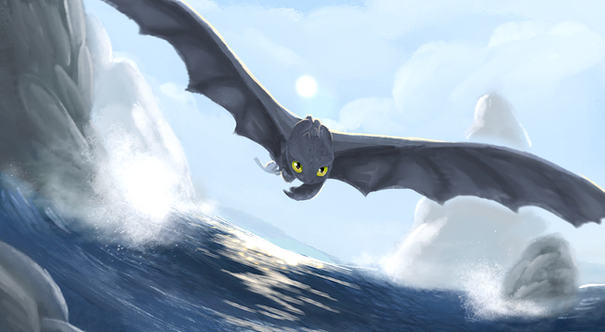 What I really love about this work is the way Toothless reflects his surroundings and actually looks somewhat wet. Besides that, this piece has a dynamism that simply captures the imagination. The tiny bit of Toothless' wing in the wave is a terrific detail. You have incorporated some lovely colours in this artwork.