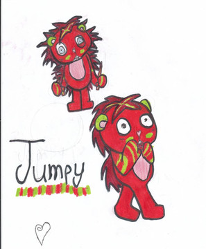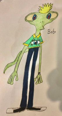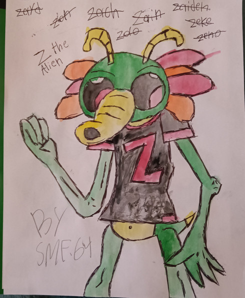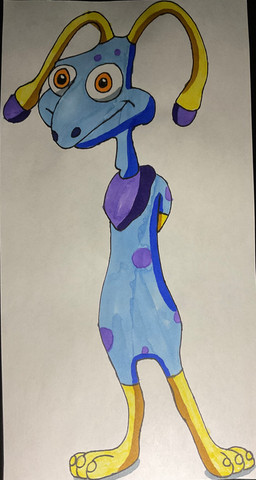 As the title states, this is actually the first character I've ever created (well, for a story. 'Characters' before him were simply childish doodles that served no real purpose). He went through quite a few redesigns before I became satisfied with this one. After his story was written...back in fourth grade or earlier I think, he was pretty much ignored for years until I came upon the book I made.Yeah, the drawings were crap, the plot's basically a massive E.T. rip-off (with the 'getting left behind on Earth and need the help of a kid to get back' theme), but he still has a special place in my heart.